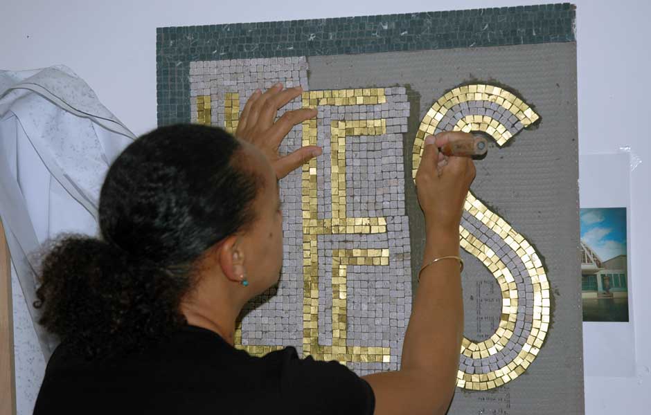 Mosaic artwork created on extruded polystyrene foam panels, delivered and installed in situ by Stuc & Mosaic studio.